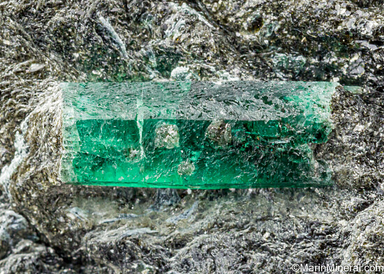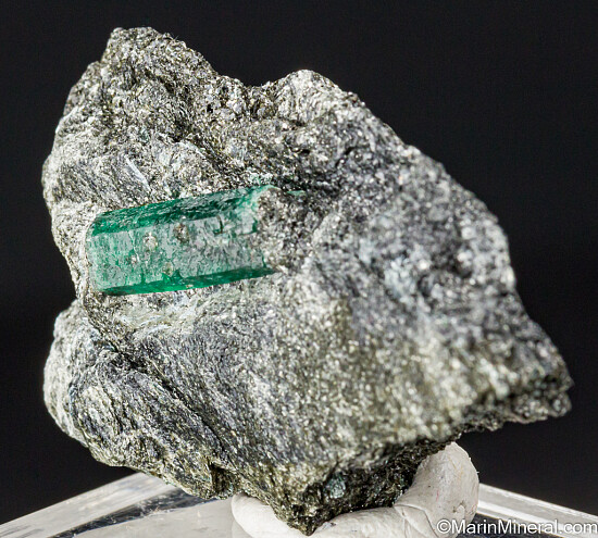 A 1.4cm Emerald in a dark schist matrix. The Emerald has great medium green color and lots of transparency.