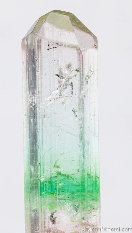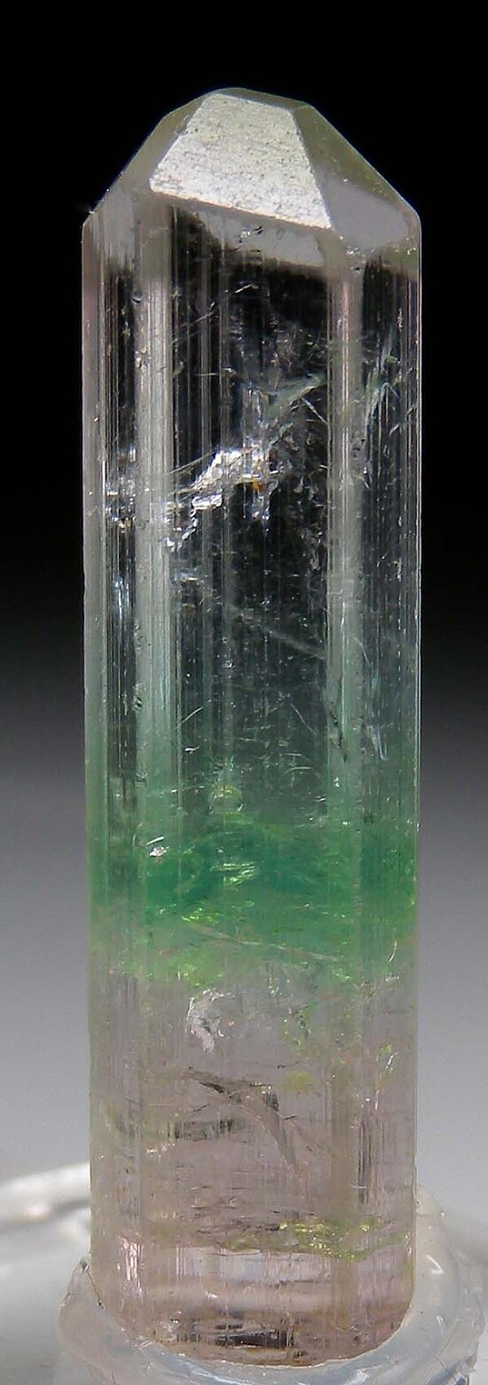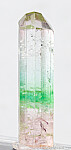 Glassy, transparent single Tourmaline with unusual coloration. It's pink at the base followed by a green zone then a colorless upper half and termination. Complete and undamaged with a steep pyramidal termination. Weighs 5.73 grams.