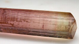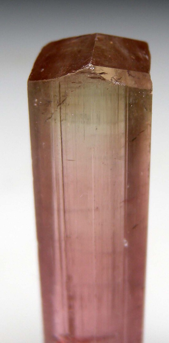 Rare gem pink Tourmaline crystal with a greenish yellow termination from Nepal. This is an excellent crystal for the locality as most are very thin, pencil-like crystals. Though not as well known, Nepal has produced small amounts of some very high quality Tourmaline. Found long ago, this crystal is undamaged and weighs 7.23 grams.