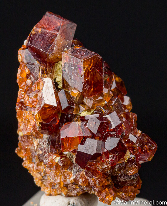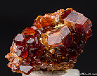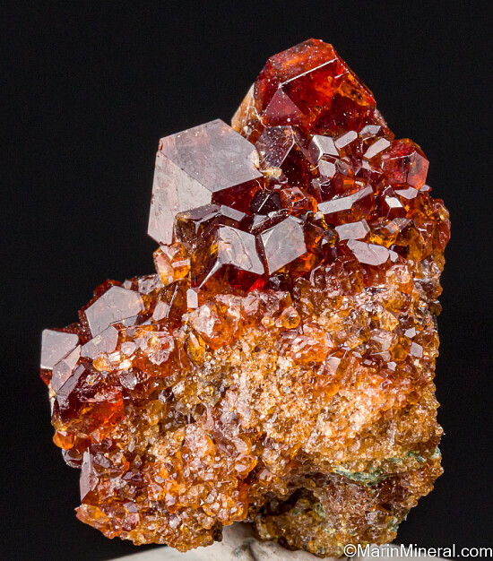 Lustrous, translucent reddish orange Garnets (likely Grossular) on matrix from Tanzania. The crystals reach 7mm in size and are sharp with glassy faces. Interesting and uncommon.