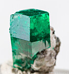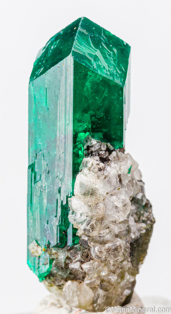 Large, elongated single Dioptase crystal. Undamaged, transparent to translucent with attached white Calcite around the base. Exceptional single thumbnail Dioptase.