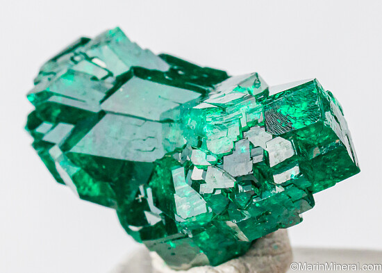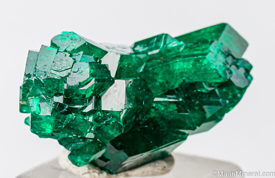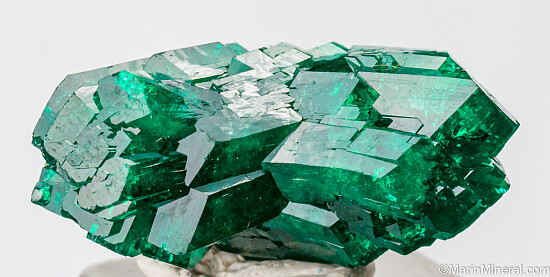 Cluster of deep emerald green Dioptase crystals from the Congo. The crystals are sharp and lustrous and show areas of transparency. This is a very special piece in a somewhat flat V shape with crystals pointing out to the left and right and merged in the center. Well crystallized front and back. Valued at $200.