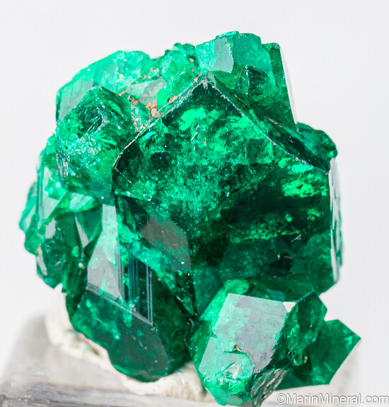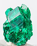 Cluster of deep emerald green Dioptase crystals from the Congo. The cluster is composed of a large central crystal with smaller attached crystals. The crystals are sharp and lustrous and show areas of transparency.