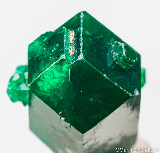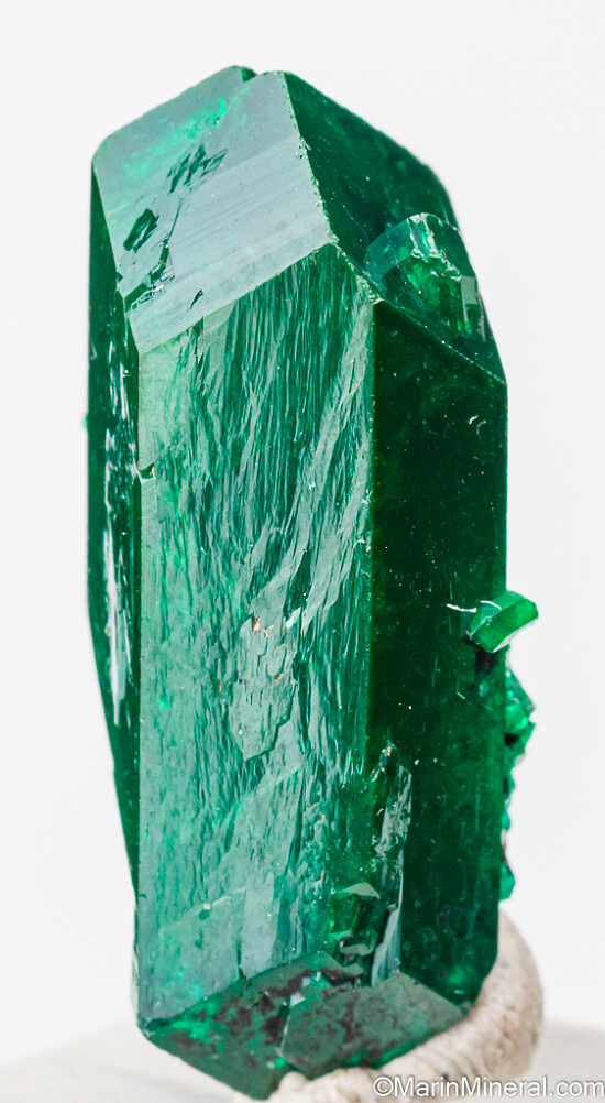 Large doubly-terminated Dioptase crystal. Bright, translucent, and deep emerald green. Both terminations are prefect. It has a smooth indentation on part ofthe backside where it was attached to matrix, and a small indentation from another crystal, otherwise it's perfect all around. Valued at $300.