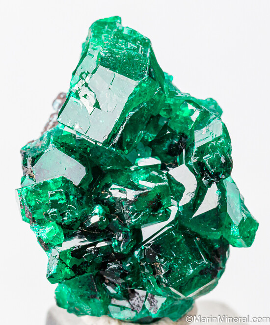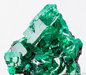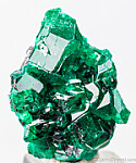 Cluster of deep emerald green Dioptase crystals from the Congo. The crystals are sharp and lustrous and show areas of transparency. Big and chunk crystals to 1.3cm.