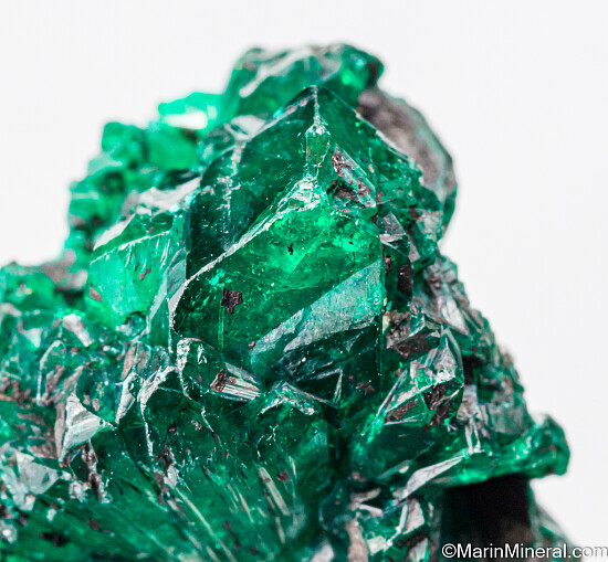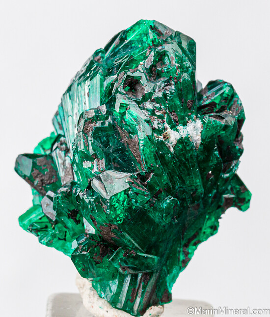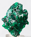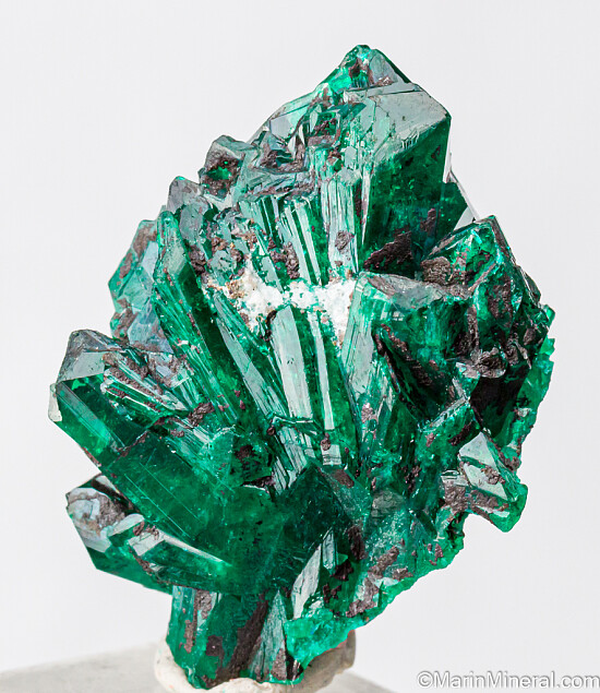 Large diverging cluster of deep emerald green Dioptase crystals from the Congo. The crystals are sharp and lustrous and grow around a central large crystal that is 1cm wide. Good damage free cluster.