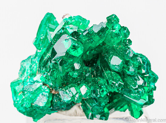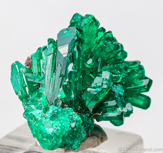 Cluster of bright, translucent, deep emerald green crystals of Dioptase from the Congo. The Dioptase form elongated crystals to 1cm that rise stright up off a matrix of Dioptase. Very nice, glassy crystals.