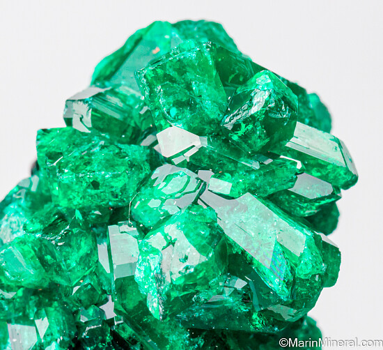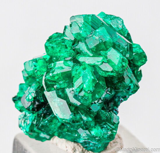 Cluster of bright, translucent, deep emerald green crystals of Dioptase from recent finds in the Congo. The crystals are stout and reach 9mm in length. Good crystals everywhere on a small amount of rock matrix. Valued at $125.