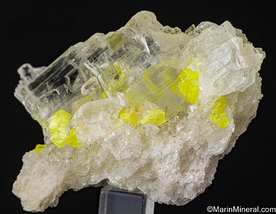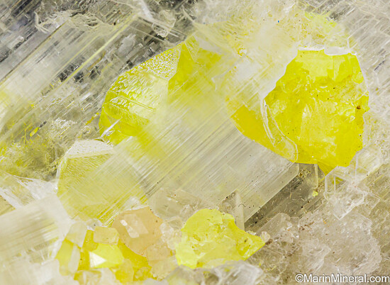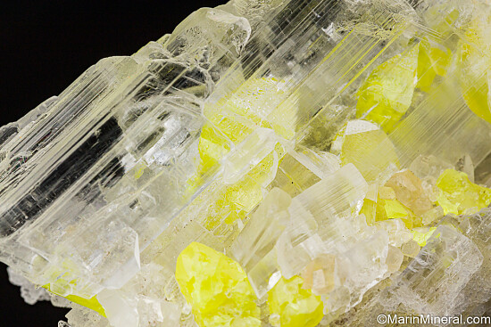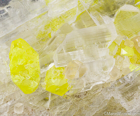 Bright yellow crystals of Sulfur attached and fully included within transparent Gypsum var. Selenite. Sulfur inclusions in Selenite are uncommon and this is an excellent example. See the current issue of Mineralogical Record for an article on this locality.