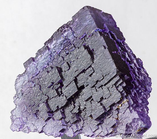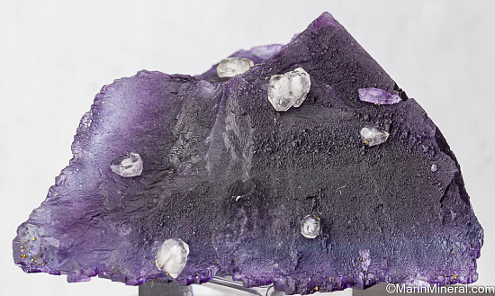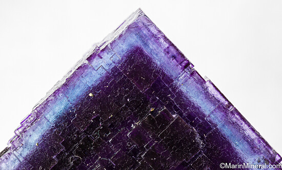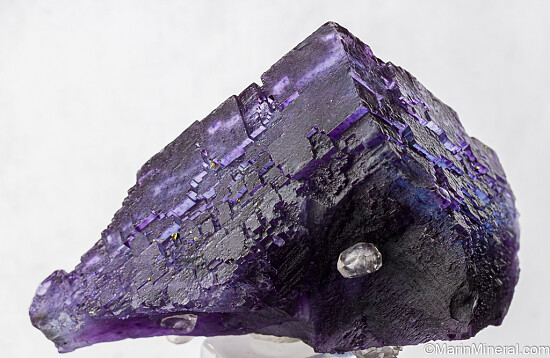 Beautiful Illinois Fluorite specimen with stepped cubic faces on the front and etched surfaces on the backside. Translucent deep purple color with a bright blue outer layer. Small Calcite crystals are attached to the backside.