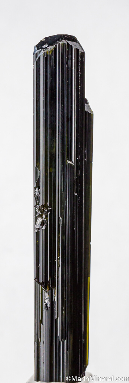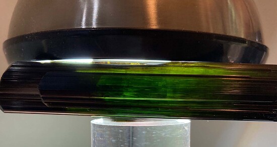 Large, deep green, transparent single Tourmaline crystal from recent production at the famous St. Anne's mine in Zimbabwe. Tourmaline has been very rare from this mine historically, which has primarily targeted blue Topaz. Most Tourmaline found here occur as small pencil-like crystals and this large crystal in an anomaly. Though dark, it is transparent facet grade green throughout with a more greenish brown color at the termination. There is a bit of edge chipping along one side, otherwise it's complete all around and perfect. Weighs a hefty 50.8 grams. With high quality Congo Tourmaline selling for $200 to $300 per gram (or much more), I value this at $40/gram, or about $2000 for the crystal.