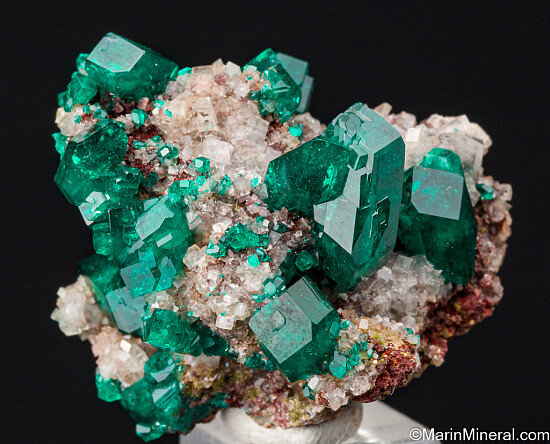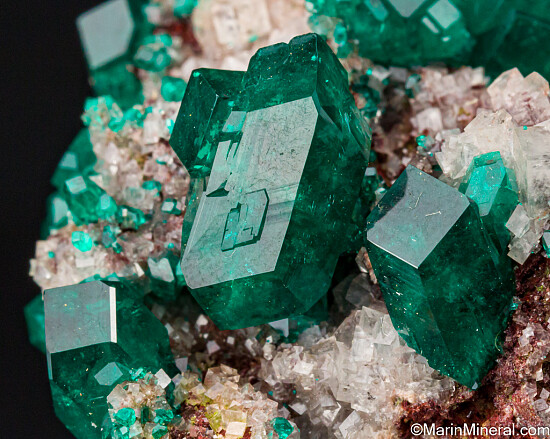 Pristine, high quality Dioptase crystals on white rhombic Calcite crystals. The crystals reach 1.4cm in size, many of which are double-terminated, including the largest crystal. This is an old Rock Currier specimen. Fine and undamaged.