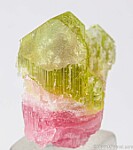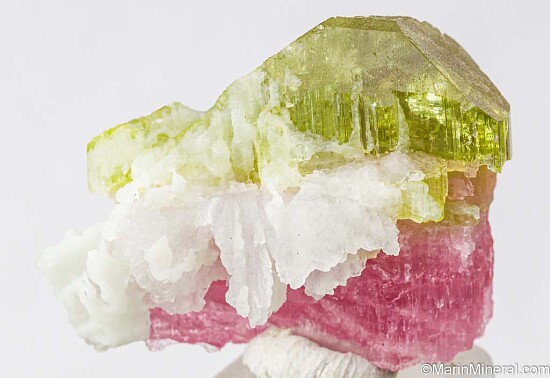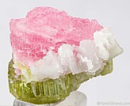Etched bi-color (pink and green) Tourmaline from the Himalaya Mine. This is a really neat specimen, complete and undamaged with etched surfaces all around, except for the origianl flat termination faces atop the green end. Even white Albite crystals along the side show etching. The pink portion is translucent and the green portion shows transparency.