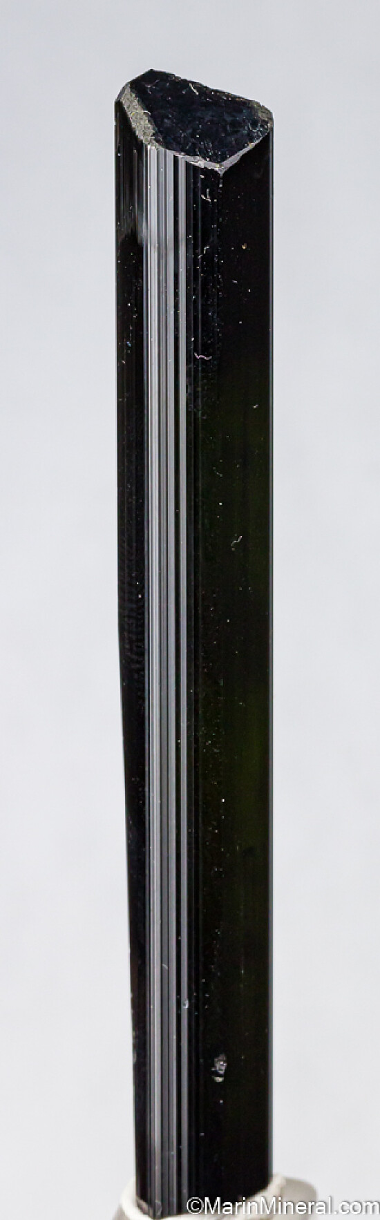 Stunning large gem Tourmaline crystal recently mined from the famous St. Anne's Mine in the Karoi district of Zimbabwe. Well terminated, complete crystal though with chatter on one termination face. It's transparent medium green color over most of the crystal with a darker green termination (The top is likely transparent like the smaller crystals from the find, this one is just to thick to get light through). This is one of the largest I saw from the find, a beautiful and rare Tourmaline. Weighs 36.43 grams. Valued at $600 or more.