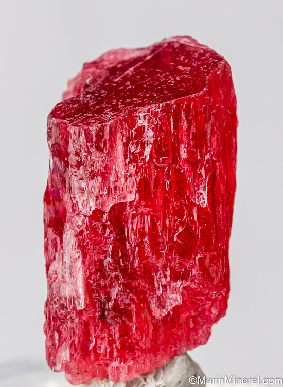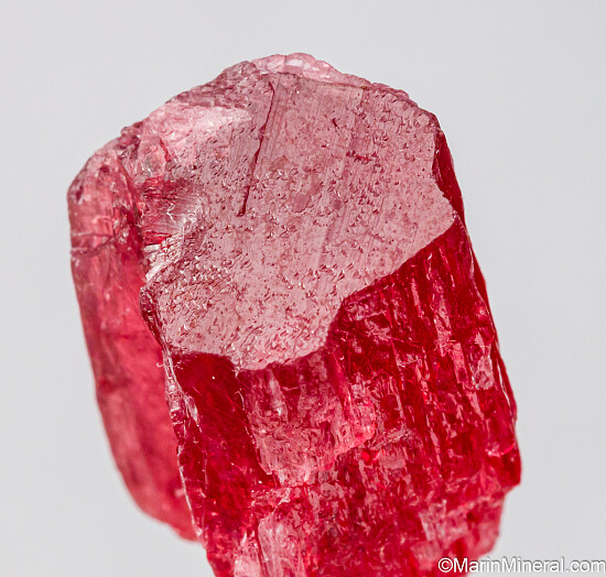 Single gem crystal of Rhodonite from recent finds in Brazil. Etched around the edge faces and translucent to transparent internally. Superb color has vaulted these Brazilian crystals to the best of species category for Rhodonite. This crystal weighs 4.64 grams and is valued at $300.
