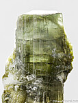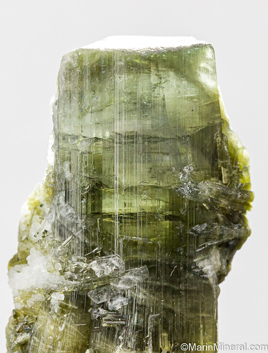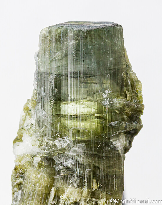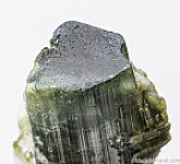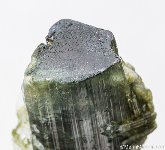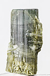 Single terminated Tourmaline crystal from the Himalaya Mine in San Diego, California. The Tourmaline is complete all around and green grading up to blue/green at the termination. There is a slight bend to the crystal due to fracturing and rehealing during growth. Weighs 19.01 grams.