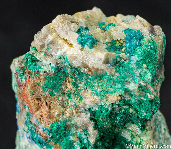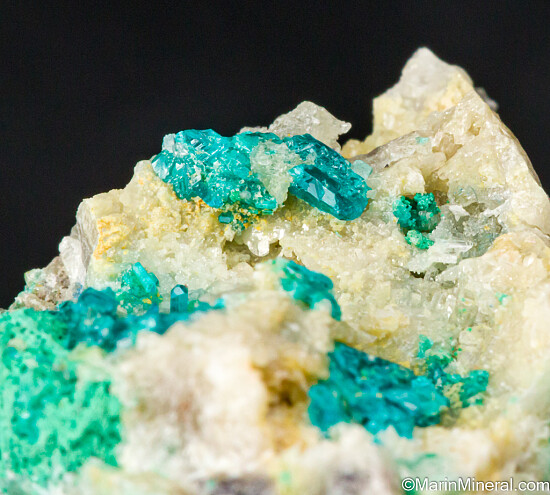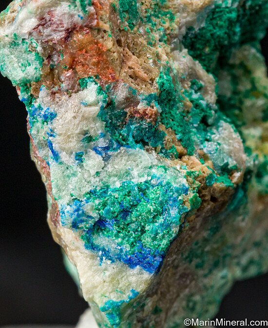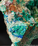 Crystals of blue Caledonite, green Brochantite, and Cerussite from the Rowley Mine in Arizona. There are also a couple small areas of darker blue Diaboleite. Caledonite is a rare lead copper sulfate carbonate mineral. Highly mineralized, colorful specimen. The largest individual Caledonite crystal is on top and measures 2mm. Ex. Dan Evanich.