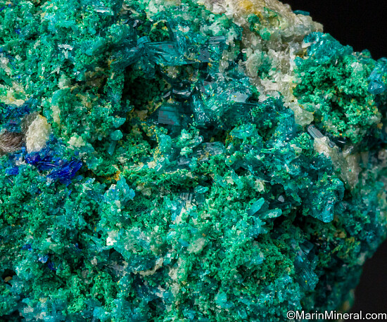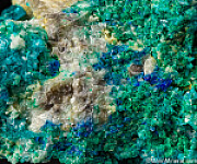 Crystals of blue Caledonite, green Brochantite, and Cerussite from the Rowley Mine in Arizona. There are also a couple small areas of darker blue Diaboleite. Caledonite is a rare lead copper sulfate carbonate mineral. Highly mineralized, colorful specimen. Lots of Caledonite with crystals on both sides. Ex Dan Evanich and comes with with his label.