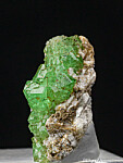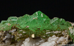 Elongated faden-like Tsavorite crystals on a matrix of Calcite crystals. This is an uncommon form of Tsavorite (Grossular) that are not often seen on matrix. There is a Diopside crystal and small Pyrite crystals in association. Great thumbnail from the Merelani Tanzanite mines.