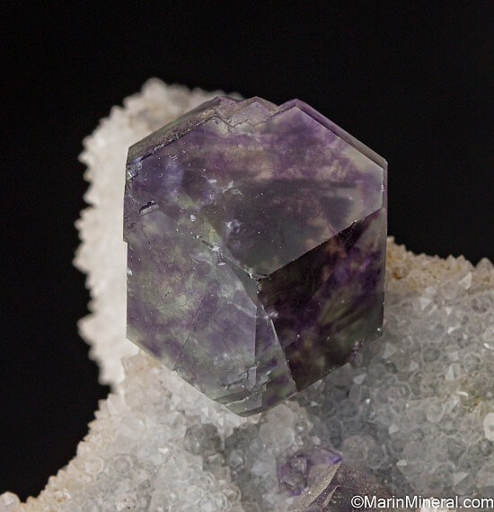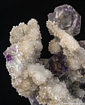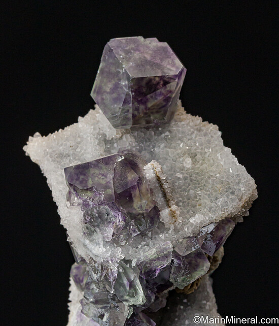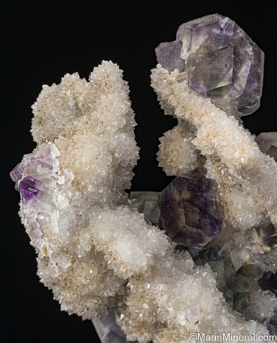 Sculptural specimen of transparent purple Fluorite crystals atop a Quartz crystal coated matrix. The Fluorite crystals reach 1.8cm in size. Out of an old collection and comes mounted on a Lucite stand.
