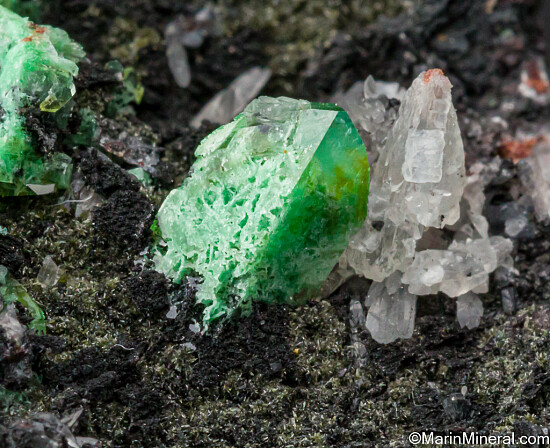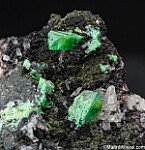 Isolated bright green crystals of Zincolivenite (a mineral formerly known as Cuprian Adamite) with Cerussite. The crystals reach 0.5cm in size and contrast well against the dark matrix.