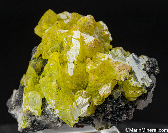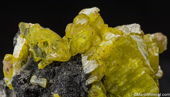 Gemmy bright yellow Ettringite crystals on black Manganite. Quality crystals with great color. There are some flat contact faces from former Calcite, but no damage.