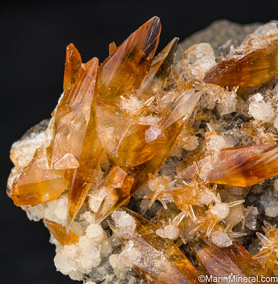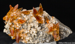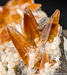 Elongated, gem quality reddish orange Calcite crystals on a matrix coated by Chabazite and Thompsonite. Ex. Tim Sherburn collection.
