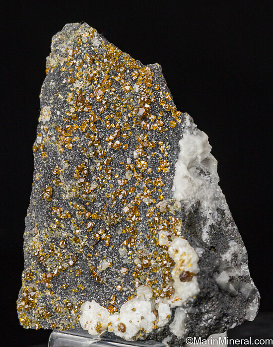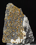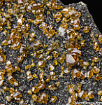 Small, gemmy yellow Sphalerite crystals scattered across a dark rock matrix. Well separated crystals with high luster giving lots of sparkle to the specimen. Ex. Tim Sherburn collection.