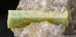 A 2.1cm Aquamarine crystal embedded in Quartz. There are a few other small Aqua crystals in the Quartz. Ex. Tim Sherburn collection, from Peter Briscol.