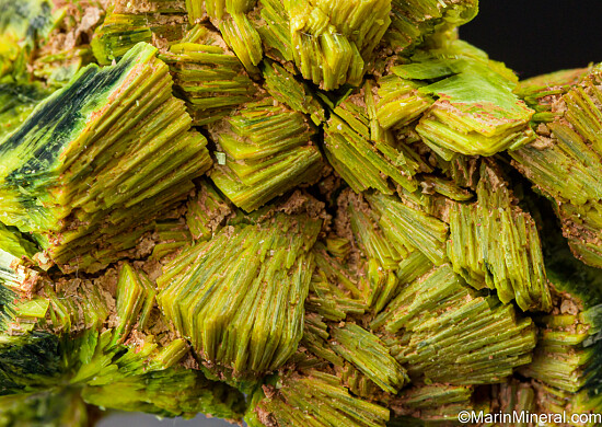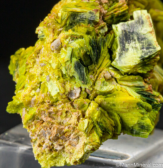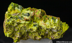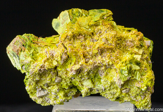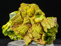 Superb specimen of solid Autunite with a bright green-yellow coloration. The crystals form thick clusters or 'books' representative of the mine. These were mined decades ago and are now USA classics. Valued at $200.