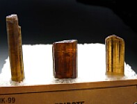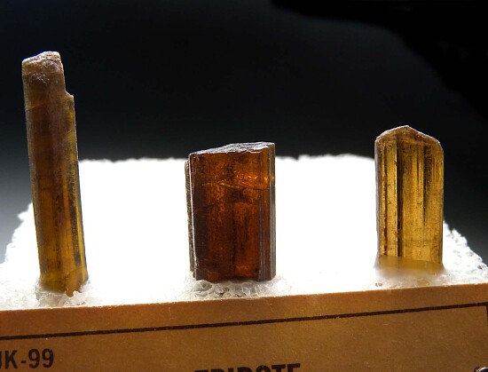 Three crystals of translucent to transparent Epidote crystals from Zimbabwe. Mounted on an old stand from Grieger's.