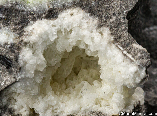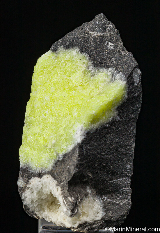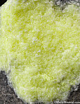 Nodule of solid Sulfur in a hard grey rock matrix. There is a small vug of white Calcite crystals just below the Sulfur. Ex. Tim Sherburn collection.