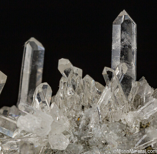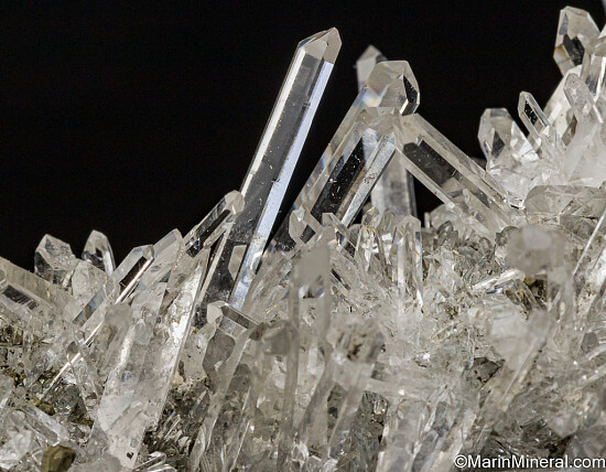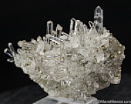 Cluster of slender, water-clear Quartz crystals and small Pyrite crystals. Comes with a couple old labels indicating it was collected by David Green and Paddy Geoghen, the mine owner. This was the best one found at the mine and was saved for a museum, but later reaquired by David Green. Ex. Tim Sherburn collection.