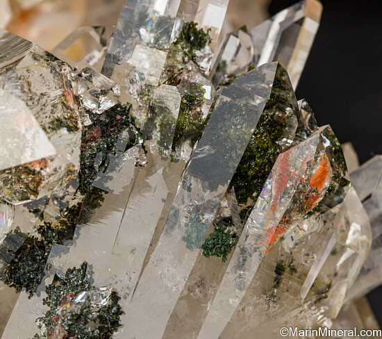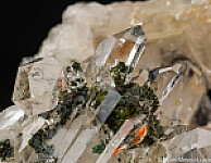 Beautiful cluster of transparent Quartz crystals with attached and included green Epidote. Comes with an old note indicating it was collected at the cliff top at Ardamore at the east side of Smerwick Harbour. Ex. Tim Sherburn collection acquired from the David Green collection in 2014.