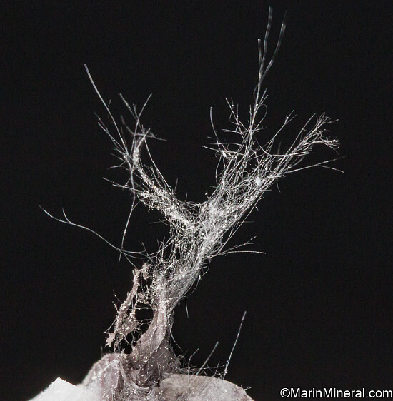 Dark filament-like Boulangerite on white Calcite collected in 2004. Ex. Tim Sherburn collection purchased by Tim in 2013.