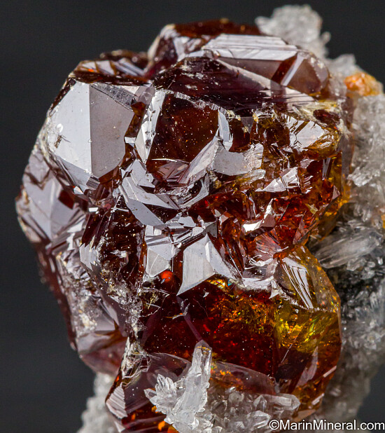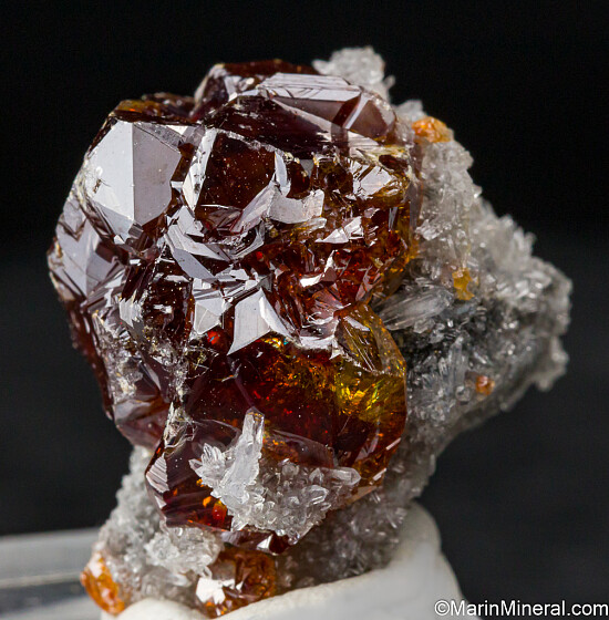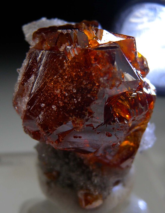 Gem orange Sphalerite on Quartz crystals. The Sphalerite is transparent and 1.9cm wide.