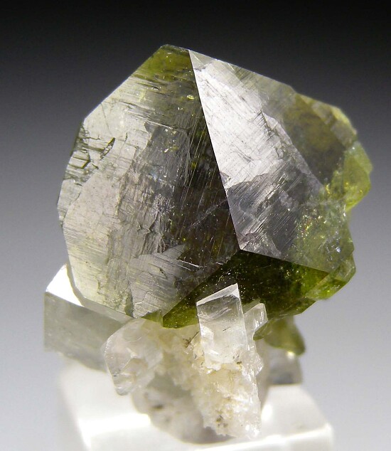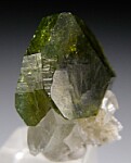 Single green Uvite crystal (a Tourmaline species) atop white Magnesite. Highly lustrous and transparent to translucent. Complete front and back, contacted on the lower right side. Ex. Chuck Trantham collection.