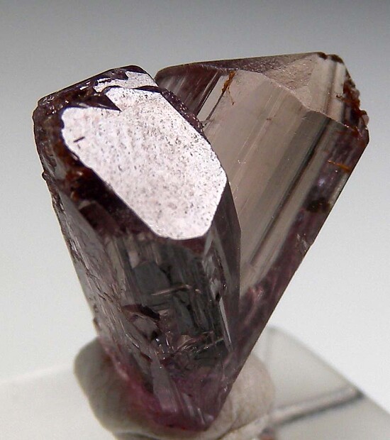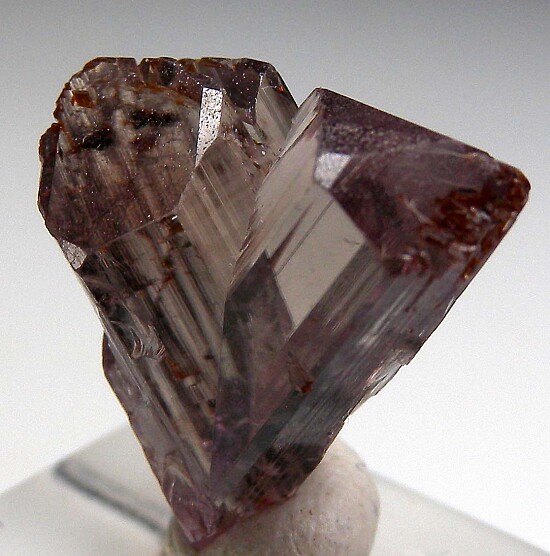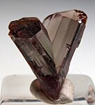 V-twin crystal of color change Diaspore. From new finds in the mountains near Milas, these new Diaspore crystals are spectacular in color and form. Glassy, flat termination faces on both 'arms'. Complete and undamaged with the point of contact at the bottom of the 'V'. Gem quality and transparent inside. Medium purple color in natural sunlight.