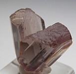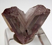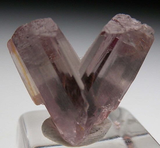 V-twin crystal of color change Diaspore. From new finds in the mountains near Milas, these new Diaspore crystals are spectacular in color and form. Glassy, flat termination faces on both 'arms'. Complete and undamaged except for the missing bottom of a small sidecar crystal and with the point of contact at the bottom of the 'V'. Gem quality and transparent inside. Medium purple color in natural sunlight.