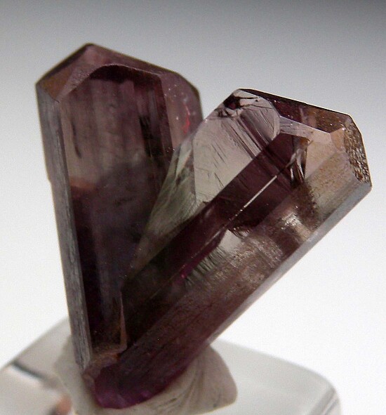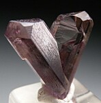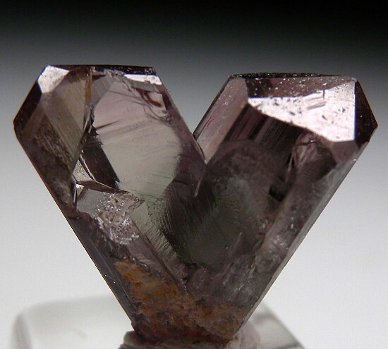 V-twin crystal of color change Diaspore. From new finds in the mountains near Milas, these new Diaspore crystals are spectacular in color and form. Glassy, flat termination faces on both 'arms'. Complete with undamaged terminations. The backside has a natural indentation and a small area of contact at the base. There is also a shallow cleave along part of the left side. This one has great form and was the marquis piece of one small parcel I received from Turkey. Gem quality and transparent inside. Medium purple color in natural sunlight.