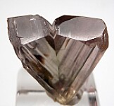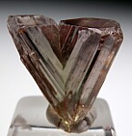 V-twin crystal of color change Diaspore. From new finds in the mountains near Milas, these new Diaspore crystals are spectacular in color and form. Glassy, flat termination faces on both 'arms'. Complete and undamaged except for possible cleaving along one side and with the point of contact at the bottom of the 'V'. Gem quality and transparent inside. Medium purple color in natural sunlight.