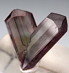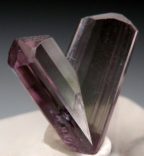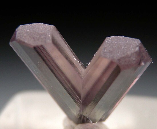V-twin crystal of color change Diaspore. From new finds in the mountains near Pinarcik, these new Diaspore crystals are spectacular in color and form. Glassy, flat termination faces on both 'arms' with a small point of contact at the bottom tip. Complete and undamaged. Gem quality and transparent inside. Medium purple color in natural sunlight.