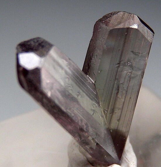 V-twin crystal of color change Diaspore. From new finds in the mountains near Pinarcik, these new Diaspore crystals are spectacular in color and form. Glassy, flat termination faces on both 'arms' with a small point of contact at the bottom tip. Complete and undamaged, though there are some small irregular growth surfaces on teh back faces that hardly distract in person. Gem quality and transparent inside. Medium purple color in natural sunlight.