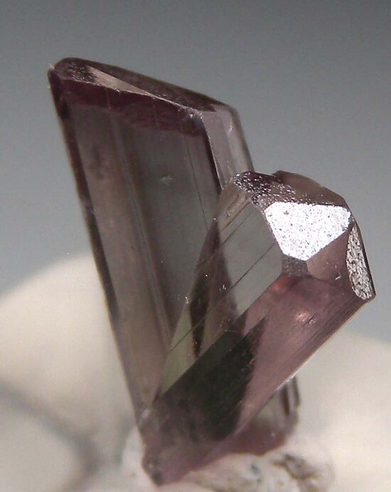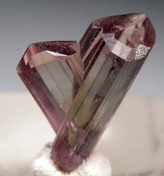 V-twin crystal of color change Diaspore. From new finds in the mountains near Pinarcik, these new Diaspore crystals are spectacular in color and form. Glassy, flat termination faces on both 'arms' with a small point of contact at the bottom tip. Complete and undamaged. Gem quality and transparent inside. Medium purple color in natural sunlight.