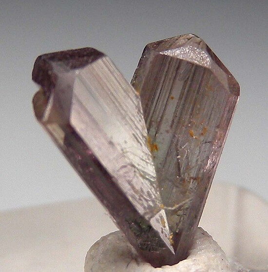 Glassy and gemmy V-twin crystal of color change Diaspore from new finds in the mountains near Pinarcik. These new Diaspore crystals are spectacular in color and form. Small but perfect crystal with flat termination faces on both 'arms'. Complete and undamaged, even the bottom tip is perfect. Gem quality and transparent inside. Medium purple color in natural sunlight. This has not been cleaned! The little bit of iron staining visible in the photos is hardly noticable in person, and can be removed.
