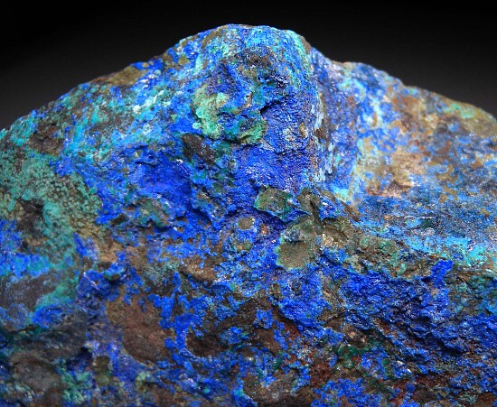 Large specimen loaded with deep blue Linarite and lighter blue/green Chrysocolla and possibly Caledonite. From MINDAT: 'The Blue Bell mine (also known as Blue Bell claims and Hard Luck mine) has been mined since 1885 mainly for lead and silver, with minor copper, zinc and gold. In the 1950s the first mineral specimens of linarite, caledonite and leadhillite started showing up, but the site gained wide recognition with John Crowley’s article in Mineralogical Record in 1977'. Large and colorful specimen.